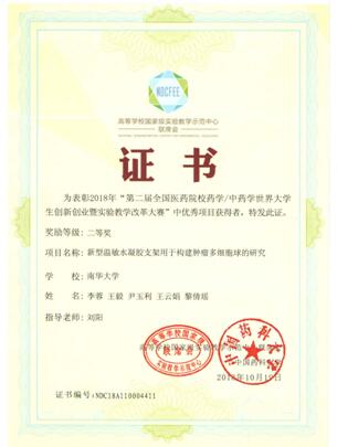 10月17日-19日,由高等学校国家级实验教学示范中心联席会和中国药科大学主办,天津大学药物科学与技术学院承办的“第二届医药院校药学/中药学世界大学生创新创业暨实验教学改革大赛”在天津举办。经过初选函评和现场答辩等多环节激烈角逐,由我校选送的伟的国际1946bv刘阳老师指导的“生物医用水凝胶创新团队”的成员李蓉、王毅、尹玉利、王云娟、黎倩瑶等参与的项目最终荣获学生创新创业二等奖。