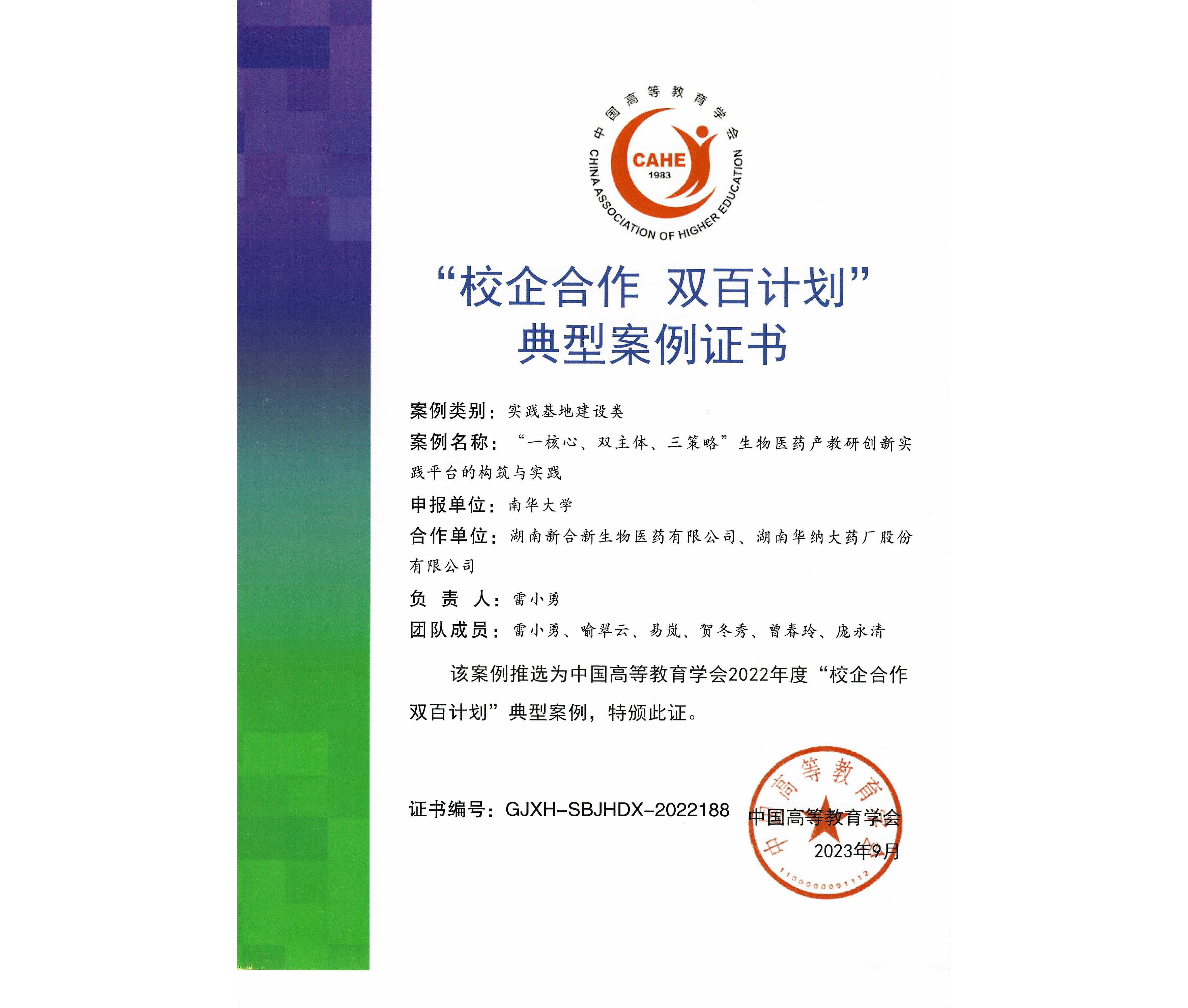近日,中国高等教育学会公布了2022年度中国高等教育学会“校企合作双百计划”典型案例名单,伟德国际victor1946联合湖南新合新生物医药有限公司,湖南华纳大药厂股份有限公司申报的《“一核心、 双主体、 三策略”生物医药产教研创新实践平台的构筑与实践》成功入选实践基地建设类典型案例。该案例负责人为雷小勇教授,成员有喻翠云、易岚、贺东秀、曾春玲和庞永清等。伟的国际1946bv党委书记袁中华应邀参加中国高等教育学会“校企合作 双百计划”典型案例研讨会并领奖。