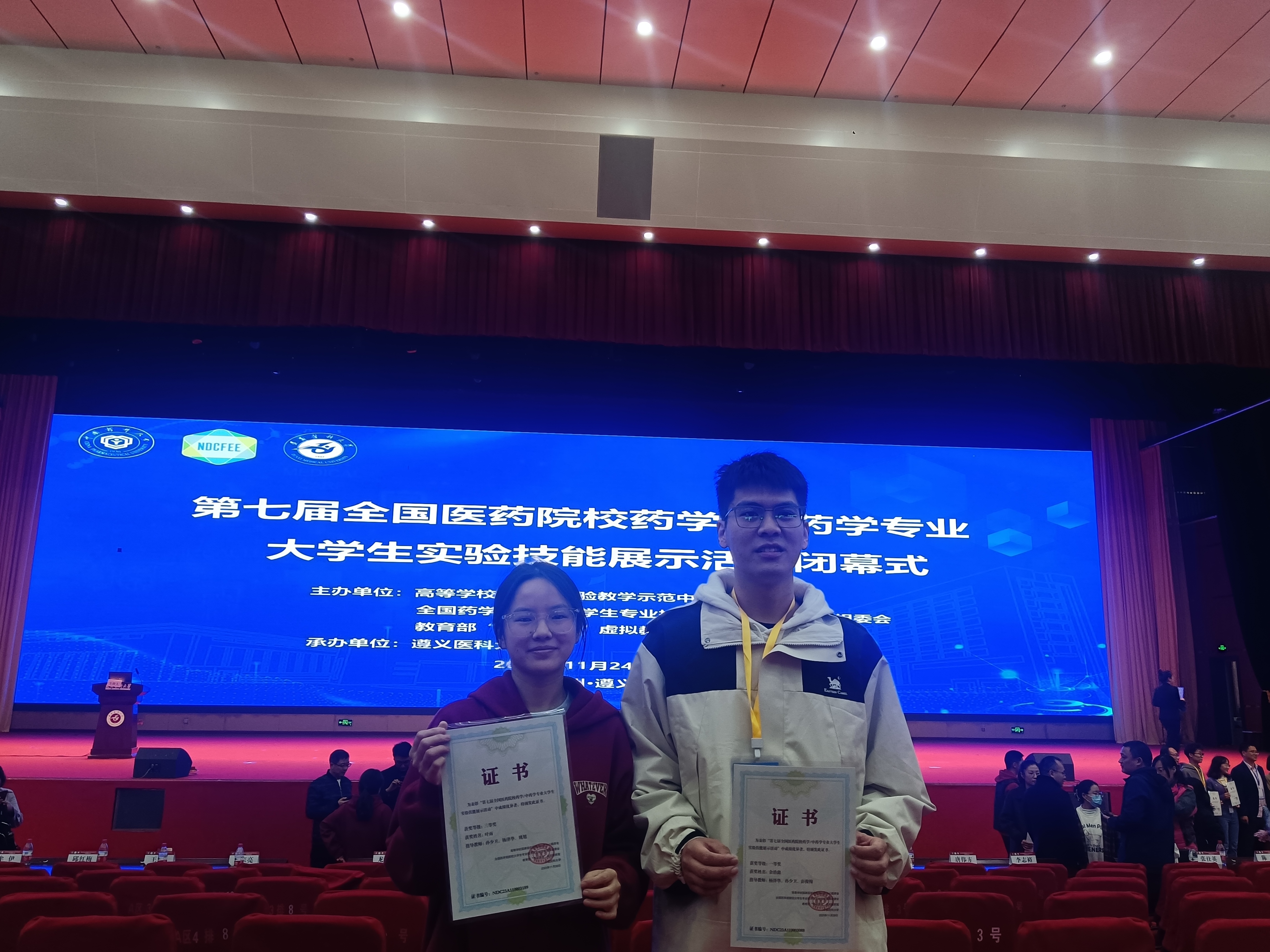 2023年11月26日,“第七届全国医药院校药学/中药学专业大学生实验技能展示活动”决赛在遵义医科大学落下帷幕。经过长达六小时的笔试和实验操作两轮展示环节比拼,伟的国际1946bv20级药学专业的余治鑫、21级药学专业的叶雨两位同学发挥出色,分别获得一等奖和三等奖。这也是伟德国际victor1946在此类比赛中国家一等奖的历史性突破。