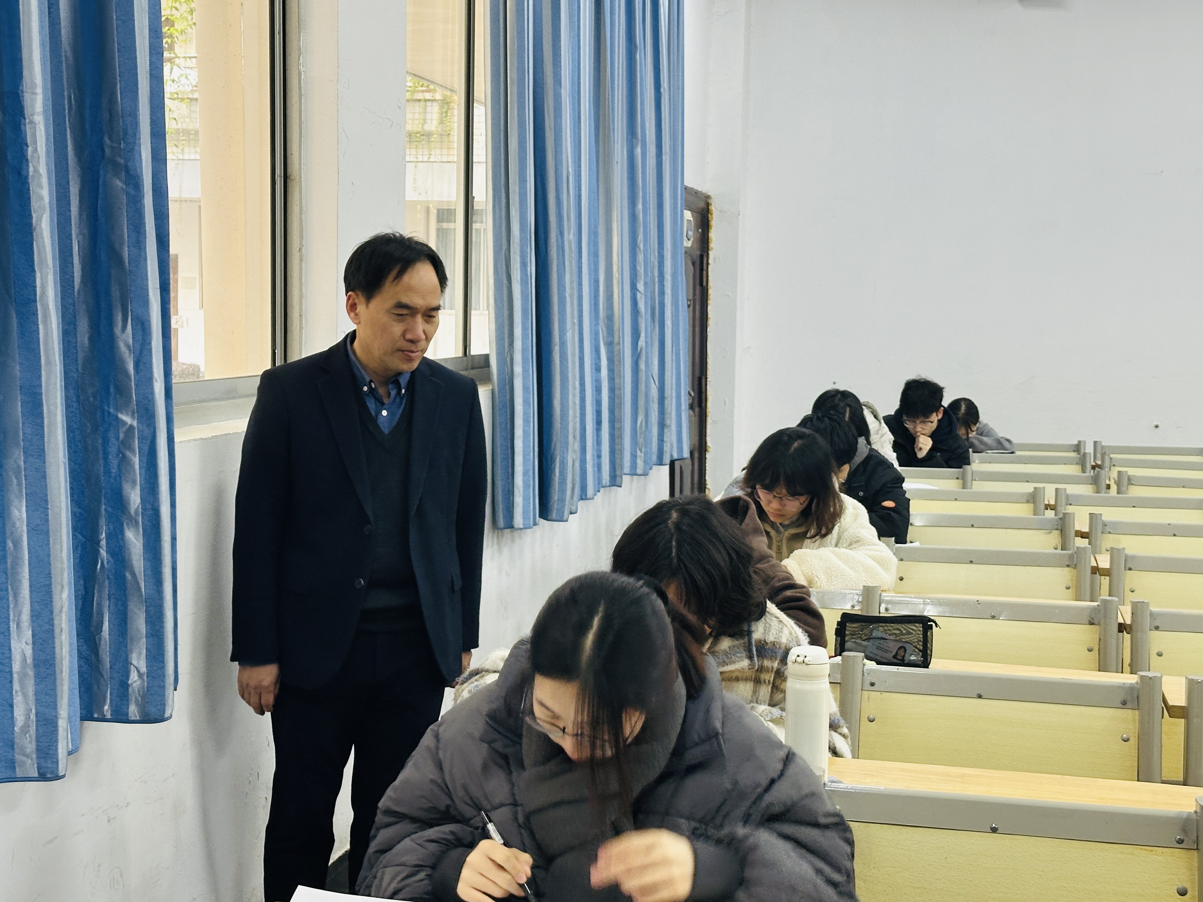首先,雷小勇一行来到药学专业《生物化学D》期末考试考场进行巡视,对每个考场的考场秩序、考场设施环境、学生考风考绩和监考教师履职等情况进行全面细致地巡查与指导。他强调期末考试是对学生一学期以来学习效果的检验,要营造公平公正的考试环境,严肃考风考纪,监考老师发现问题要及时处理,以确保期末考试工作顺利进行。从巡查整体情况来看,考试情况良好,监考教师认真负责,学生考试态度端正、遵守纪律,考场秩序井然。