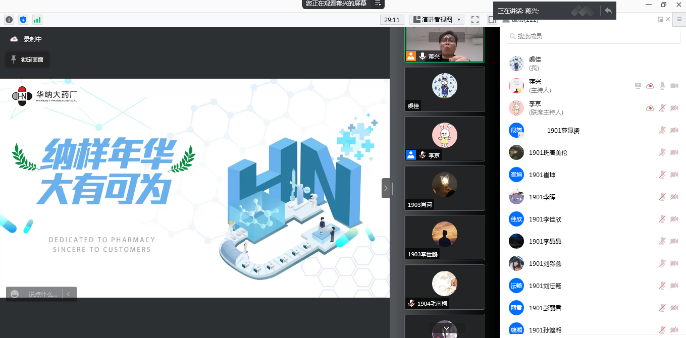虽因疫情阻隔,讲座只能线上进行,但陈晓光博士依旧热情不减、激情澎湃。他就原料药的发展史、全球原料药市场布局、药物的研发流程以及中国最新的医药政策等方面做了专业解读,使同学们更加切实地了解到当今医药行业现状以及未来发展方向,为同学们今后的职业选择与发展提供了帮助。讲座结束后,同学们就讲座内容、个人学业以及职业发展等方面,与陈博士进行了互动交流。