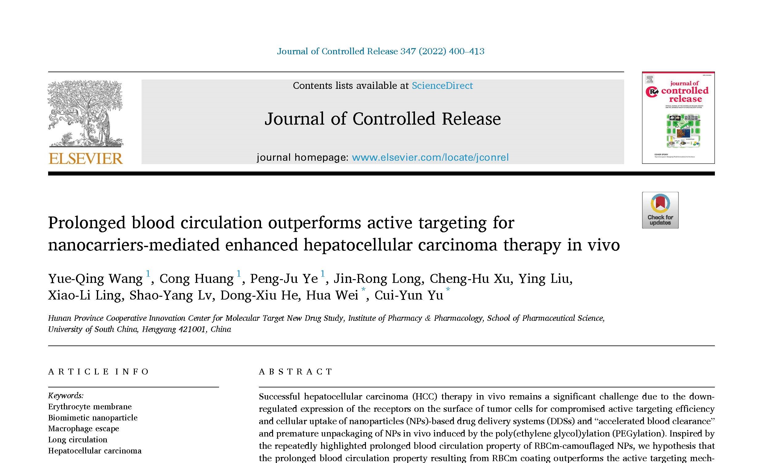 近日,伟的国际1946bv魏华教授和喻翠云教授联合科研团队在药剂学国际一流期刊Journal of Controlled Release(简称JCR,医学1区,TOP期刊,IF:9.776)上发表了题为“Prolonged Circulation Outperforms Active Targeting for Enhanced Hepatocellular Carcinoma Therapy(2022, 347, 400-413.)”的研究论文。该研究通过红细胞膜包裹天然多糖基聚合物前药纳米粒子构筑了仿生纳米载体,在小鼠体内实现了针对肝癌的高效治疗。研究首次揭示了红细胞膜赋予仿生纳米载体的血液长循环性能比纳米载体自身的肝癌细胞主动靶向性能在针对肝癌的体内治疗中发挥着更为重要的作用。仿生纳米载体在大鼠体内的血液循环半衰期(t1/2)是聚合物前药纳米粒子的3倍,是小分子化疗药物阿霉素的3.5倍,因而仿生纳米载体在荷瘤小鼠体内展现了最好的抑瘤效果。该研究为肝癌的临床高效治疗提供了理论指导。伟的国际1946bv硕士研究生汪月琴、黄聪和叶鹏举为共同第一作者,伟的国际1946bv喻翠云教授和魏华教授为共同通讯作者。这是该研究团队在近一年的时间内,连续在JCR上发表的第五篇科研成果。