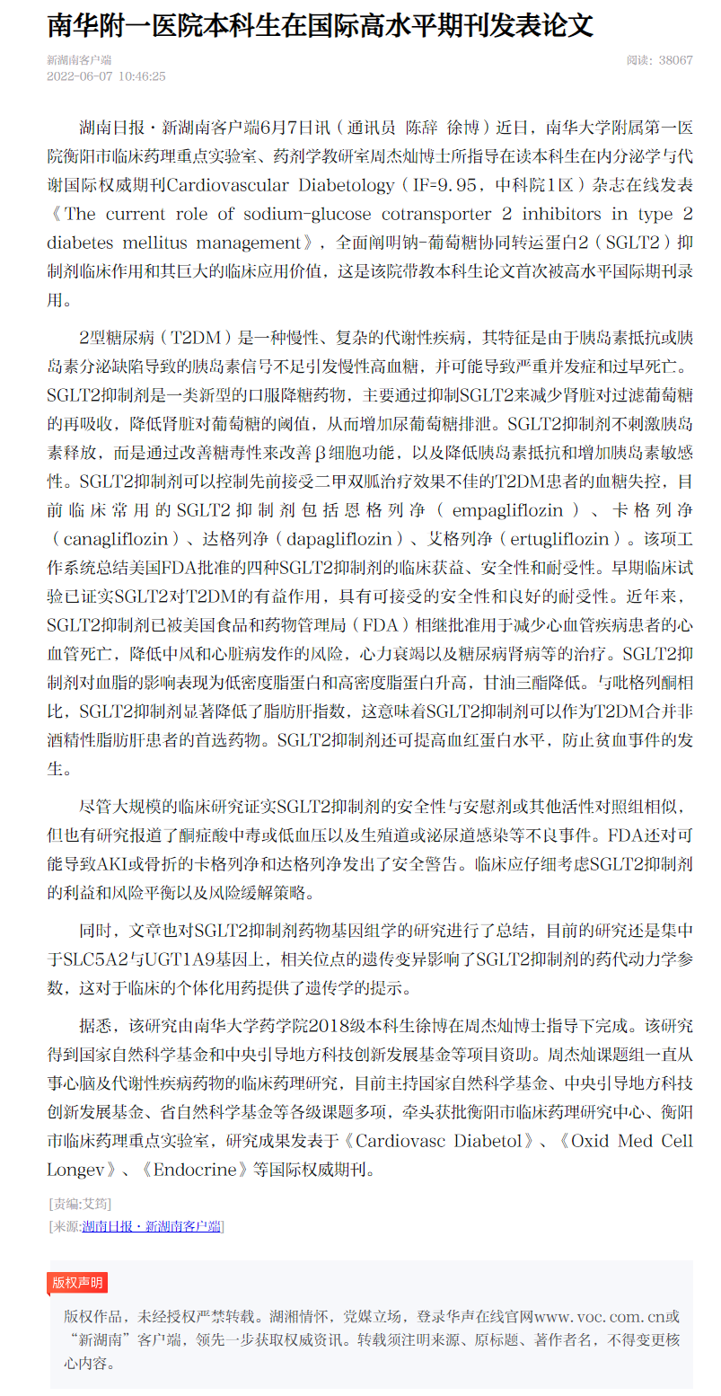 该研究由伟的国际1946bv2018级本科生徐博在周杰灿博士指导下完成。该研究得到国家自然科学基金和中央引导地方科技创新发展基金等项目资助。周杰灿课题组一直从事心脑及代谢性疾病药物的临床药理研究,目前主持国家自然科学基金、中央引导地方科技创新发展基金、省自然科学基金等各级课题多项,牵头获批衡阳市临床药理研究中心、衡阳市临床药理重点实验室,研究成果发表于《Cardiovasc Diabetol》、《Oxid Med Cell Longev》、《Endocrine》等国际权威期刊(https://m.voc.com.cn/wxhn/article/202206/202206071046253583.html)。
