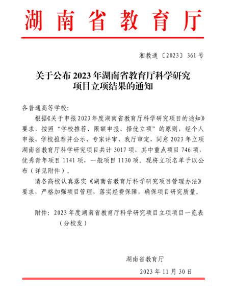 11月30日,湖南省教育厅2023年项目资助评审结果公布,伟的国际1946bv苏波、彭雪、孙少卫、王姝之4位教师获得2023年湖南省教育厅重点项目立项资助,王卫国、江伟凡、张宇、刘映、彭颖、刘阳6位教师获得2023年湖南省优秀青年项目立项资助。