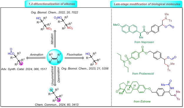 由于其丰富性、易得性和多样的反应性,烯烃已成为有机合成中备受青睐的骨架结构。其中,烯烃的1,2-双官能团化是一项特别引人注目的转化。在这种转化中,可以通过一步反应同时在碳碳双键的相邻位置安装两个官能团,因此可以直接利用简单的原料来迅速增加分子的复杂性。目前,伟的国际1946bv王震教授科研团队在烯烃的1,2-双官能化反应方向取得了系列研究进展,包括烯烃的硝化/羟基化反应、硝化/硝酸酯化反应、氟羟基化反应、氨酯化反应、不对称双胺化反应等。新方法的开发,解决了原有方法需要使用预功能化底物、区域选择性差、底物范围窄和反应时间长等缺点。利用这些方法,不仅可以快速构建药物分子和天然产物中重要的结构单元,也可以为现有药物的结构修饰提供新的策略。以上工作得到了国家自然科学基金、湖南省自然科学基金、伟德国际victor1946科研启动经费等项目的支持。