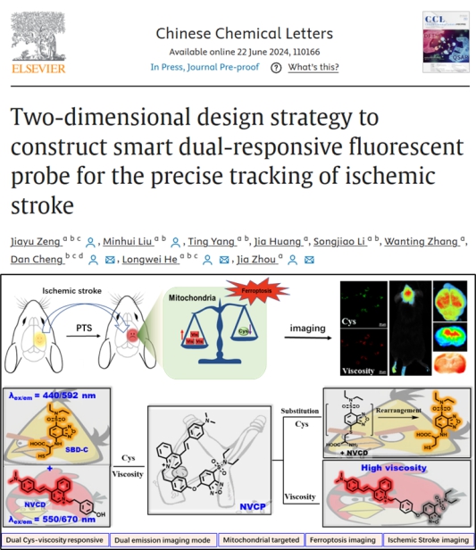 荧光成像技术由于其高灵敏度、高选择性、高时空分辨率、操作简单、低成本等优势,它作为一种新兴的检测手段在基础研究和临床诊断领域越来越受到重视。开发高性能的光学诊断试剂是实现高保真、精准检测的其中关键一环。近日,伟的国际1946bv荧光探针与生物医学成像实验室何隆薇教授团队在光学诊断试剂设计及应用取得新进展,相关研究成果以“Two-dimensional design strategy to construct smart dual-responsive fluorescent probe for the precise tracking of ischemic stroke”为题在权威期刊《Chinese Chemical Letters》(中科院1区TOP期刊,影响因子9.4)发表研究性论文。
