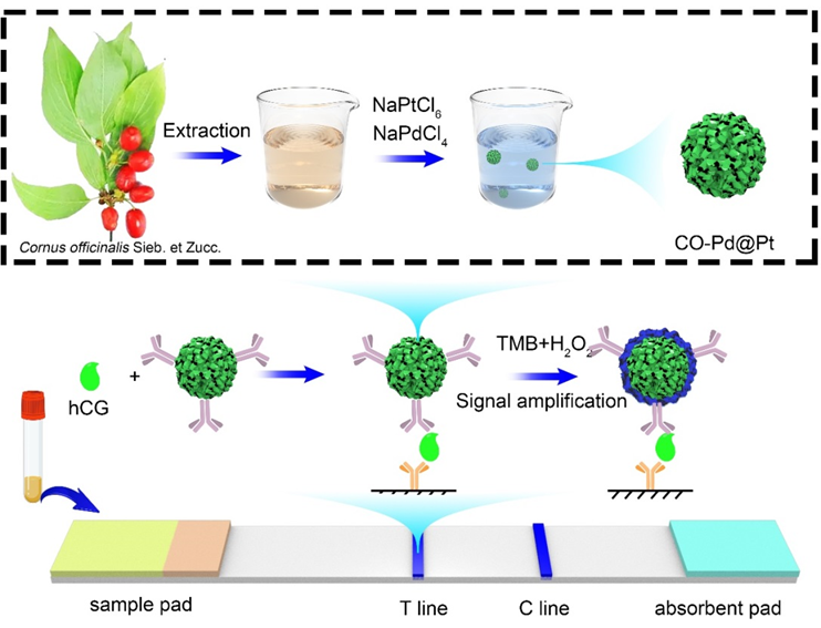 侧流免疫层析(LFIA)是经典的床旁快检(POCT)技术,具有检测便捷,效率高等优势,但其灵敏度无法满足低含量标志物的检测需求,如何改善其灵敏度依然面临不少挑战。近些年,研究人员发现搭载纳米酶的LFIA具有较高的灵敏度,其灵敏度受纳米酶表面电位限制。山茱萸是一种经典的中药材,其水提取物中含有大量的多酚、类黄酮和萜类化合物,具有较强的还原性,同时还可以为纳米酶的形成提供大量保护性电位。