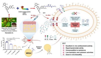 课题组基于前期在中药厚朴活性成分厚朴酚/厚朴酚的酚羟基上引入各种抗菌肽模拟物片段,构建的系列两亲性的honokiol/magnolol类衍生物(J. Med. Chem.2021, 64, 12903-12916)。活性筛选发现honokiol类衍生物5i对革兰氏阳性菌和临床分离的MRSA株表现出极好的抗菌活性,然而体内抗菌作用和万古霉素相比还有较大差距。为此,课题组基于5i的结构进行了迭代优化,设计酚羟基一端保留原有的抗菌肽模拟物,另一端的酚羟基改造成具有噁唑环和噁唑硫酮环的活性单元,以期改善其结构稳定性和抗菌活性,最终制备了两系列含氮杂环和厚朴酚-抗菌肽模拟物偶联体,经生物活性评价发现衍生物I3和E17(图5)具有优越的体内外抗MRSA活性。I3和E17在5 mg/kg剂量下,在MRSA感染的小鼠皮肤脓肿模型中,表现出优于万古霉素的治疗作用。同时机理研究揭示出衍生物I3和E17表现出与细菌细胞膜上的PG或CL的高亲和作用,转录组分析其影响了细胞膜合成和ABC转运蛋白的表达,进而导致细菌细胞膜破裂,加速细菌死亡。研究结果分别发表于Eur. J. Med. Chem.2024, 279, 116868;J. Med. Chem.2024, 67, 10.1021/acs.jmedchem.4c01860,中科院1区TOP)。