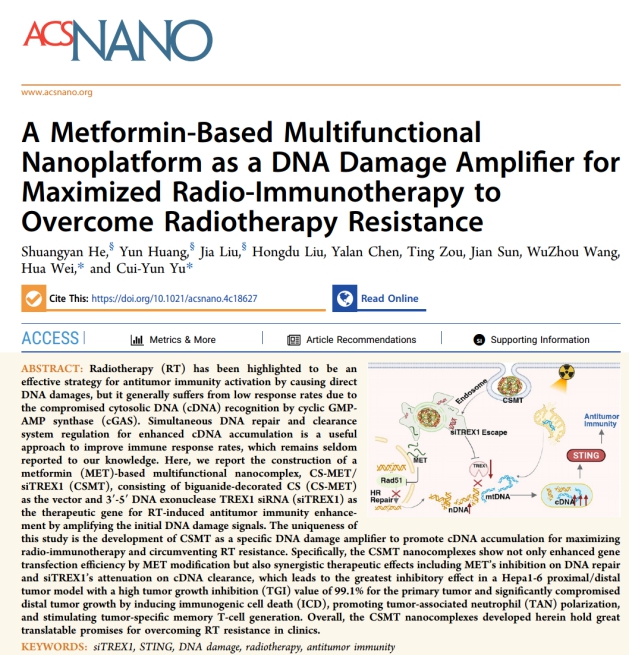 近日,喻翠云和魏华教授团队报道了一种特异性的基于二甲双胍(MET)的多功能纳米复合物CS-MET/siTREX1(CSMT)用于促进cDNA积累,以最大限度地实现放射免疫治疗并规避放疗抵抗的研究。在本研究中,该纳米复合物由双胍装饰的CS(CS-MET)作为载体和3'-5'DNA核酸外切酶TREX1 siRNA(siTREX1)作为治疗基因组成,通过放大初始DNA损伤信号来增强RT诱导的抗肿瘤免疫效果。