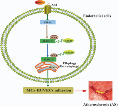 近日,陈临溪教授和李兰芳教授团队前期已发现ROS-自噬途径介导Apelin-13/APJ促单核细胞-血管内皮细胞粘附,在此基础上进一步深入探讨了介导这一过程的选择性自噬机理。结果显示内质网自噬介导Apelin-13/APJ促单核细胞-血管内皮细胞粘附,相比较于传统FAM134B为内质网自噬受体,发现在人脐静脉血管内皮细胞中,Apelin-13主要通过上调SEC62作为内质网自噬受体蛋白介导内质网自噬的发生(图1)。且血管内皮特异性敲低SEC62可显著抑制Apelin-13诱导的单核-内皮细胞黏附及黏附分子ICAM-1/VCAM-1表达以及动脉粥样硬化斑块的形成。SEC62依赖的内质网自噬发生的分子机制主要是由于泛素样4A蛋白(UBL4A)类泛素化修饰醛脱氢酶1家族成员L1(ALDH1L1)的第812为赖氨酸并帮助其插入内质网膜,维持其的内质网正确定位、产生ROS进而介导内质网自噬的发生。论文首次揭示了SEC62依赖的内质网自噬在Apelin-13/APJ信号通路诱导的单核细胞-内皮细胞粘附及动脉粥样硬化中的关键作用,干预内质网自噬途径为临床抗动脉粥样硬化治疗提供新的思路。