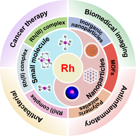 最近,我们系统地总结了这一热点领域的现有研究报道,并对铑配合物和含铑纳米材料的设计和开发在生物医学成像、癌症治疗、抗菌和抗炎等各个医学领域的应用进行了动态深入的概述。通过整合多学科视角来促进金属药物的临床转化潜力,从而弥合从实验室到病床旁的转化差距。相关论文已经发表在Materials Today Bio(中科院医学1区TOP)杂志上。