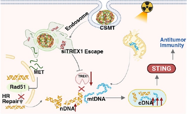 针对这一痛点,伟的国际1946bv魏华/湖南省中医药研究院喻翠云团队研发出以临床常用药二甲双胍(MET)修饰的壳聚糖(CS-MET)作为载体,以3′-5′DNA外切酶TREX1小干扰RNA(siTREX1)为治疗基因的纳米复合物的多功能纳米复合物(CS-MET/siTREX1,简称CSMT),通过放大初始DNA损伤信号来增强放疗诱导的抗肿瘤免疫并克服放疗耐受性。MET可抑制DNA修复,特异性下调同源重组修复关键蛋白RAD51,让放疗造成的DNA双链断裂难以修复,持续放大损伤信号,siTREX1沉默3'-5'DNA外切酶TREX1,减少cDNA在胞质中的清除,使其积累量提升2.7倍,充分激活cGAS-STING免疫通路,使细胞质中堆积的损伤DNA成为强烈的“危险信号”。两者协同极大强化了“cGAS-STING”免疫通路的激活,最终成功诱导了强大的抗肿瘤免疫应答和长期免疫记忆,在Hepa1-6近端/远端肿瘤模型中实现高达99.1%的原发肿瘤抑制率和显著的远端肿瘤抑制效果。该研究为克服临床放疗抵抗提供了一种极具转化潜力的新颖策略,有望改善临床治疗效果。