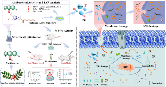 郭勇和杨瑞阁课题组针对这一科学问题,以天然产物花椒毒素为母体结构,通过化学修饰引入吡啶季铵盐活性基团,成功设计并制备了系列种新型花椒毒素-吡啶季铵盐衍生物。经过系统的抗菌活性筛选与安全性评估,衍生物III13表现最为突出,其对MRSA的最小抑菌浓度(MIC)仅为1 μg/mL,兼具低细胞毒性、极小溶血作用的优势,同时具备快速杀菌能力和破坏MRSA生物膜的特性。进一步机制研究揭示,其可能通过“抑制相关DNA的复制+靶向细菌膜磷脂酰甘油”的机制发挥抗MRSA作用,可规避耐药风险。在动物模型实验中,III13在MRSA感染的皮肤脓肿和败血症模型中疗效可与万古霉素媲美,且安全性良好。该成果近日发表于《European Journal of Medicinal Chemistry, 2025, 300, 118139》(中科院1区,论文链接:https://doi.org/10.1016/j.ejmech.2025.118139)。