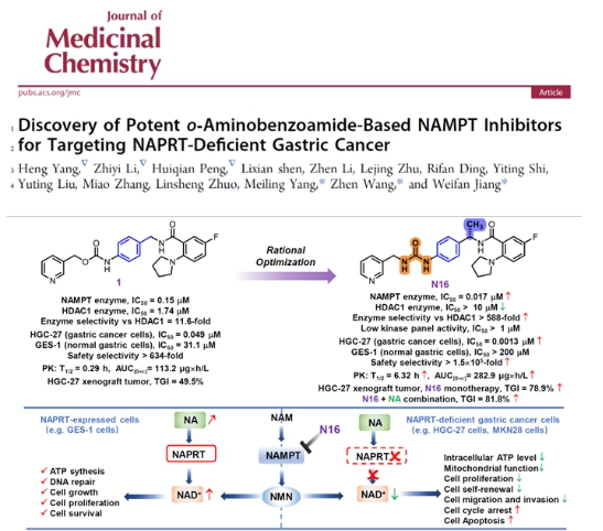 本研究在前期发现NAMPT抑制剂9a的基础上,围绕分子结构与成药性开展进一步优化,设计并合成了一系列新型衍生物,获得候选化合物N16。该化合物对NAMPT具有纳摩尔级抑制活性,并对NAPRT缺失的胃癌细胞表现出显著而高度选择性的抗增殖作用,同时对正常胃上皮细胞毒性极低。机制研究表明,N16通过非竞争性抑制NAMPT,选择性耗竭肿瘤细胞NAD⁺/ATP水平,从而诱导能量代谢失衡和细胞凋亡。动物实验结果显示,N16具有良好的口服药代动力学特征和显著的体内抑瘤效果。值得关注的是,研究发现联合补充烟酸可在不削弱抗肿瘤疗效的前提下明显缓解造血系统毒性,显著拓宽治疗窗口,为NAMPT靶向治疗的安全应用提供了新的联合用药策略。该项研究进一步深化了团队在NAMPT靶向抗胃癌领域的系统性研究,标志着相关候选分子由“靶点发现”向“高效、安全、可转化”方向持续推进。研究成果发表于Journal of Medicinal Chemistry(中科院一区Top期刊,https://doi.org/10.1021/acs.jmedchem.5c02564)。本论文通讯作者为伟的国际1946bv王震教授、江伟凡博士和阳美玲主任,第一作者为伟的国际1946bv博士后阳衡、硕士研究生李志毅和彭慧倩,伟的国际1946bv为第一通讯单位。