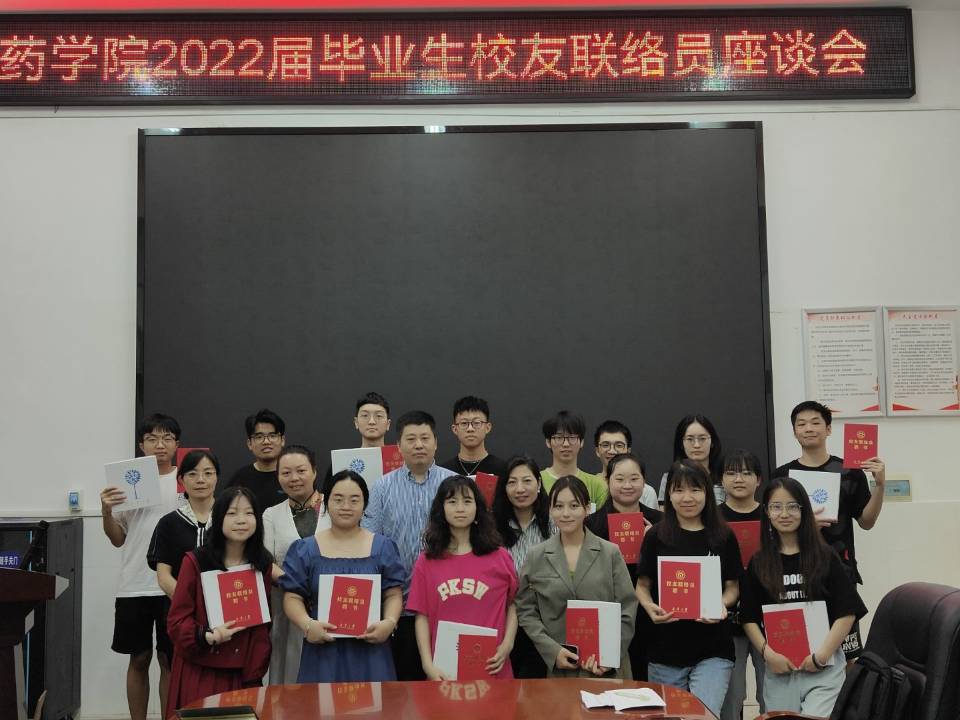 2022年6月1日上午,伟的国际1946bv2022届毕业生校友联络员座谈会在药学楼101会议室召开。院党委书记袁中华、院长喻翠云、院党委副书记陈健平、院学工室主任单云丽以及2022届毕业生校友联络员参加了此次会议。座谈会由袁中华主持。