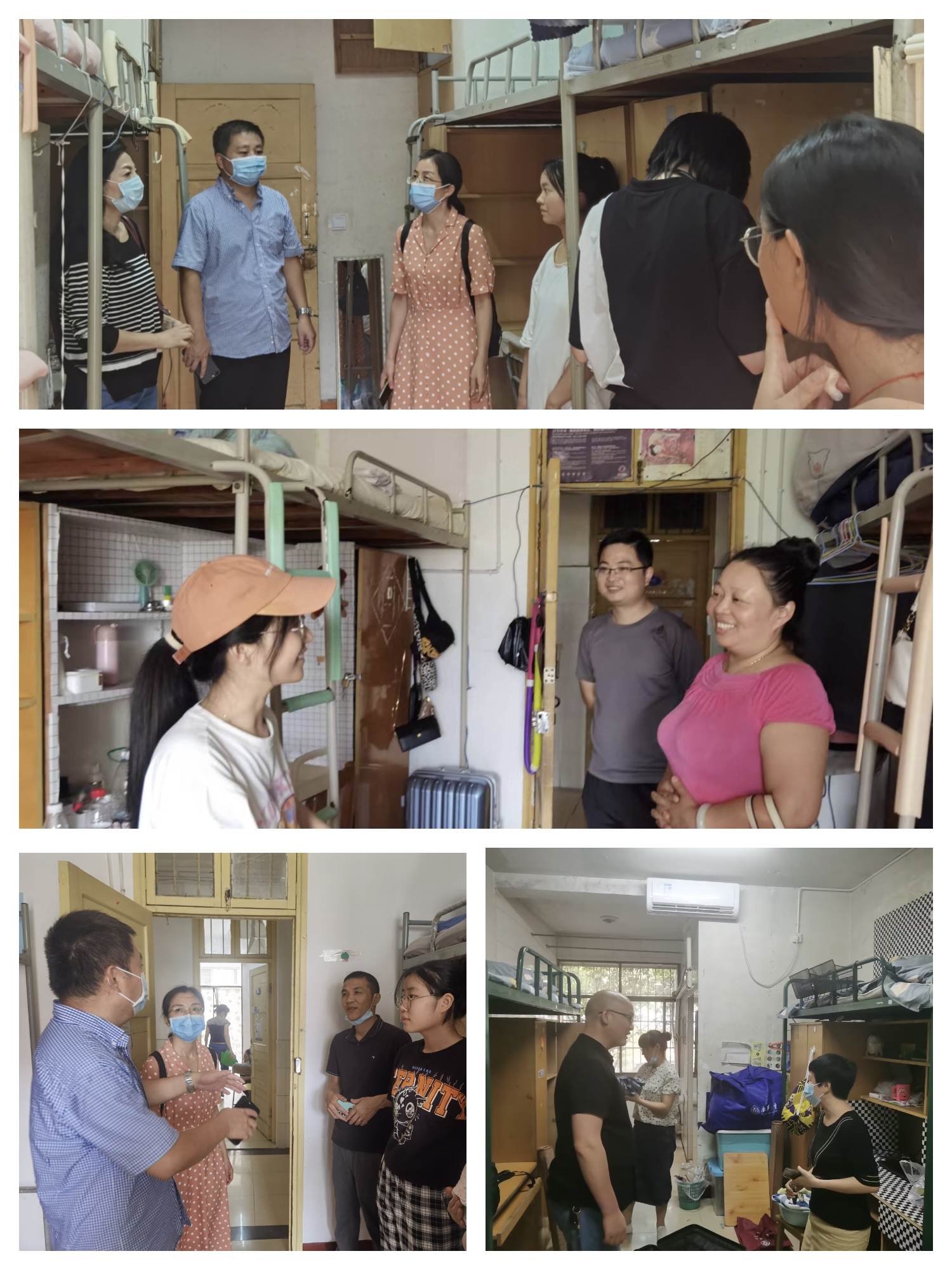 9月2日-3日,学院党委书记袁中华、院长喻翠云、院党委副书记陈健平、副院长易岚、王力立及学工室全体辅导员走访了2022级迎新现场及本科生、研究生宿舍,深入了解新生的住宿情况、入住感受,了解同学们关于住宿的困难和需求,对新环境的适应情况。走访慰问过程中,学院领导老师和同学们进行了深入交谈,仔细查看了新生住宿环境,耐心细致地回答同学们的问题。在疫情防控常态化形势下,学院领导叮嘱同学们要做好疫情防控措施,遵守学校疫情防控相关规定;鼓励新生同学要提高自我管理能力,养成良好的学习、生活习惯,同时加强体育锻炼,提高身体素质,共同营造良好的生活、学习环境。