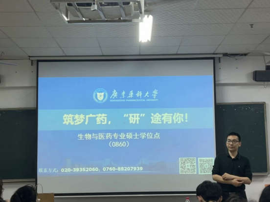 在讲座上,同学们通过观看2025年广东药科大学生物与医药研究生的招生视频,对其研究生招生计划有了初步了解。接着,曹华教授上台,向同学们展示了广东药科大学的基本概况以及教育机制,着重介绍了生物医药专业的优势与前景,同时也提供了往年的招生情况作为参考,使同学们进一步了解了广药的考研信息。