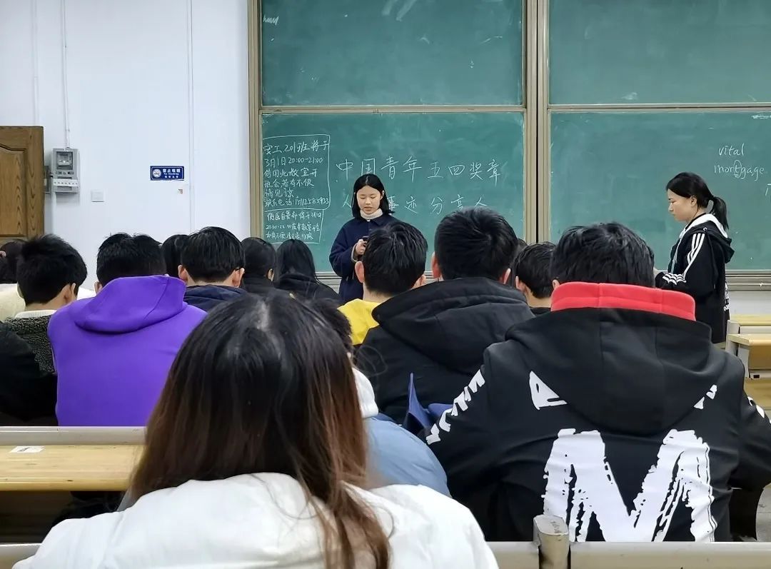 此次活动中,各班团支部为班级全体同学解读了“中国青年五四奖章”的具体内容,并介绍了“中国青年五四奖章”获得者的典型事例。通过了解奖章的获得者,同学们将向优秀青年看齐,明白自己重任在肩。同时,同学们也分享了自己对“中国青年五四奖章”获得者事迹的感想,并对如何在以后的生活中做一个合格的青年发表了自己的看法和建议。在各班级团支部的精心组织和同学们的积极配合下,本次主题团日活动落下了圆满的帷幕。