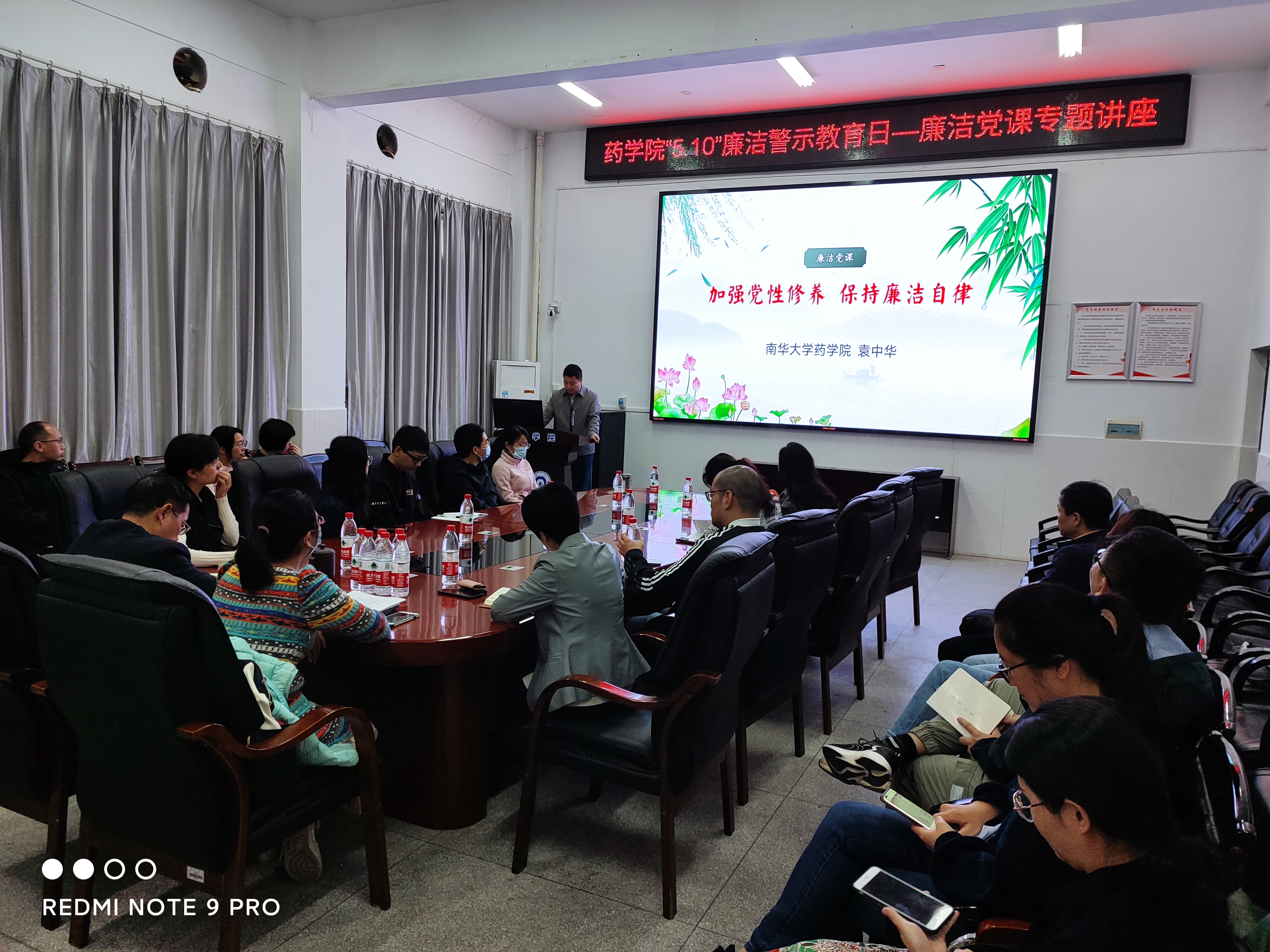 5月11日上午,伟的国际1946bv党委在药学楼B101会议室举办了“5·10”廉洁警示教育日之廉洁党课专题讲座活动,院党委书记袁中华以“加强党性修养,保持廉洁自律”为题进行廉洁党课宣讲,全院30余名党员干部聆听了讲座。