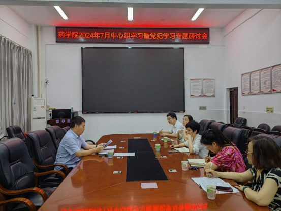 2024年7月5日下午,伟的国际1946bv第7次中心组集中学习暨党纪学习专题研讨会在药学楼B101会议室举行。会议由院党委书记袁中华主持,全体党委委员及综合科主任参加学习会。