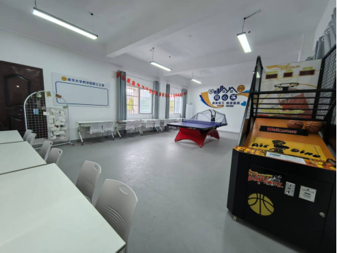 “同心苑”取“同心同德、同心协力”之意,寄托了学院凝聚人心、共建和谐的深切期望。走进“同心苑”,明亮整洁的环境映入眼帘。地面铺设了专业运动地胶,为教职工提供了安全的活动空间,购置的乒乓球桌、投篮机,供教职工在闲暇之余挥洒汗水、放松身心;配备了空调、智能饮水机、可移动桌椅以及壁柜,空间合理分区,宣传墙巧妙融入药学文化元素,整体设计简约温馨,营造出浓厚的学院特色与家一般的归属感。