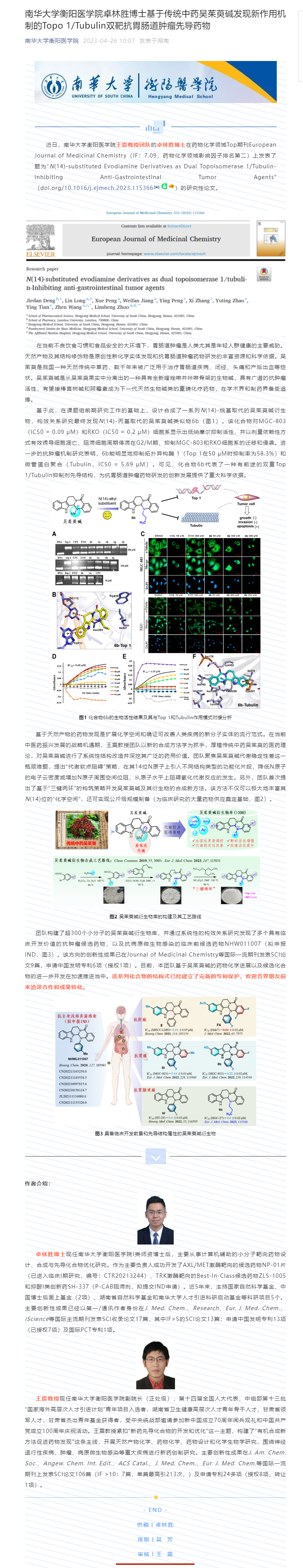 近日,伟德国际victor1946衡阳医学院、肿瘤微环境响应药物研究湖南省重点实验室王震教授团队的卓林胜博士在药物化学领域Top期刊European Journal of Medicinal Chemistry(IF:7.09,药物化学领域影响因子排名第二)上发表了题为“N(14)-substituted Evodiamine Derivatives as Dual Topoisomerase 1/Tubulin-Inhibiting Anti-Gastrointestinal Tumor Agents”(doi.org/10.1016/j.ejmech.2023.115366)的研究性论文。