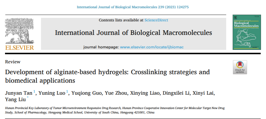 近日,伟德国际victor1946衡阳医学院伟的国际1946bv药学专业本科生谭俊艳等在国际期刊International Journal of Biological Macromolecules(《国际生物大分子杂志》,中科院1区Top期刊)在线发表题为“Development of Alginate-based Hydrogels: Crosslinking Strategies and Biomedical Applications(基于海藻酸的水凝胶的研究进展:交联策略和生物医学应用)”的论文。伟德国际victor1946衡阳医学院伟的国际1946bv为该论文的唯一单位,谭俊艳和硕士生罗宇宁为共同第一作者,肿瘤微环境响应药物研究湖南省重点实验室青年教师刘阳博士为通讯作者。